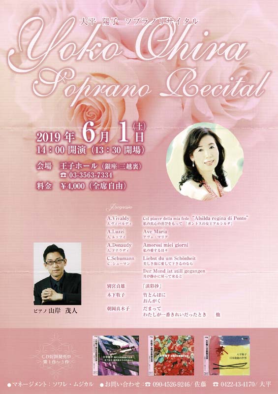 大平陽子(新高22E)ソプラノリサイタル ツイート 日 時:2019年6月1日(土) 13:30開場 14:00開演 入場料:4,000円(全席自由) 会 場:王子ホール(銀座三越裏) マネージメント:ソワレ・ムジカル お問い合わせ: TEL: 090-4526-9246(佐藤) TEL/FAX 0422-43-4170(大平) mail: email hidden; JavaScript is required 2019年3月22日 カテゴリー:同窓会会員のイベント等/タグ: 大平陽子