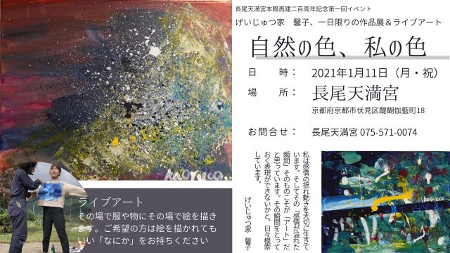 長尾天満宮本殿再建二百周年記念第一回イベントとして、一日限りの作品展&ライブアート「自然の色、私の色」を開催します。