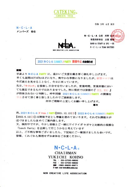 2021 N・C・L・A SUMMER PARTYの開催を中止させて頂く事と致しましたので