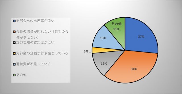 アンケート結果から支部の運営上、「会員の増員が図れない」及び「支部会の出席率が低い」が