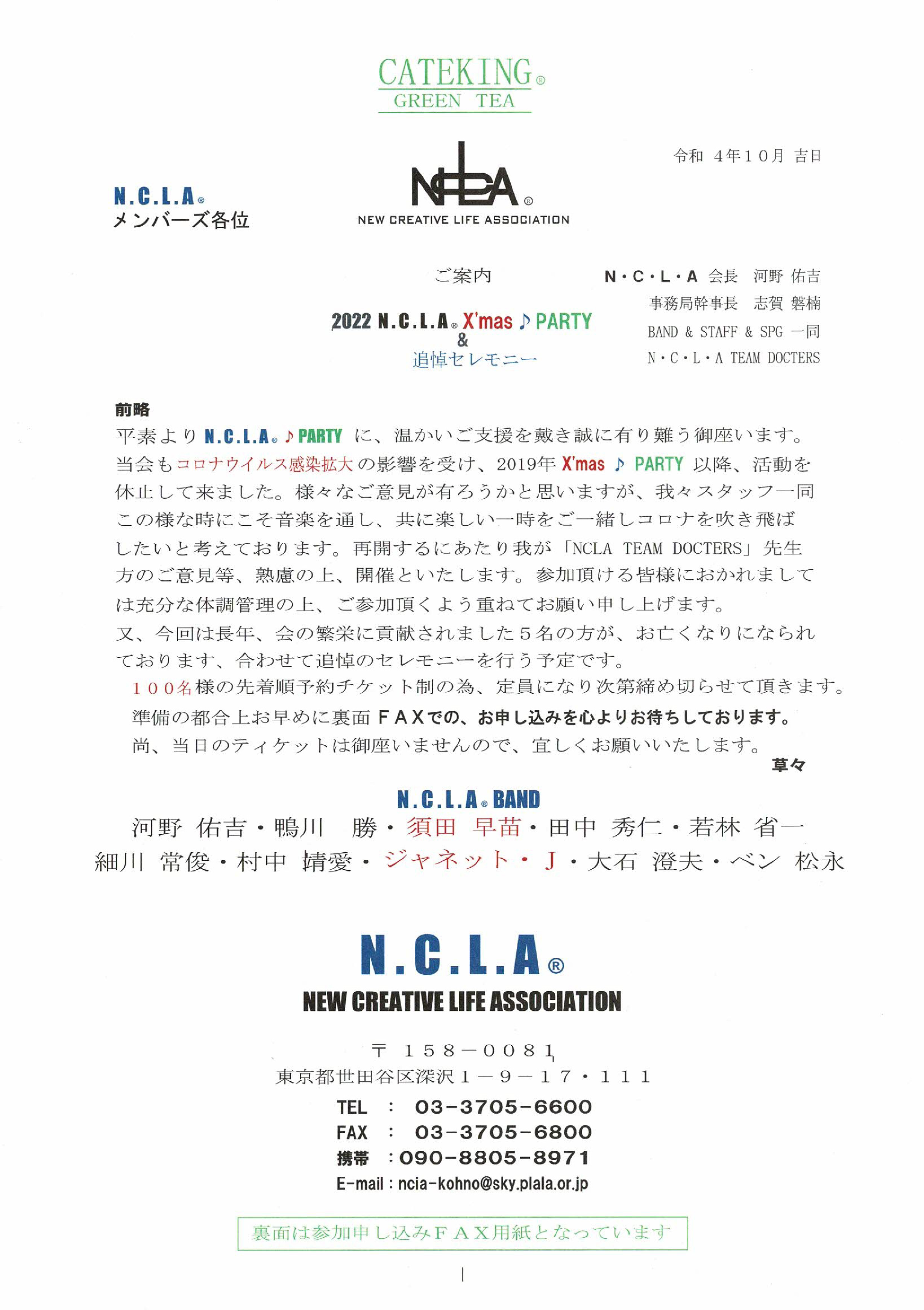 2022N・C・L・A X'mas PARTY&追悼セレモニーを下記の通り開催致します。