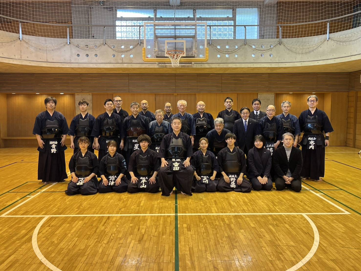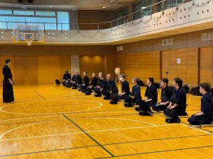 同日正午より、成城大学トレーニングセンター1Fのトレーニングルームにて、約30名の現役学生、剣道部OBが集まり、香田郡秀師範と一緒に1時間の稽古に汗を流しました。何十年ぶりにお会いする先輩方もいらっしゃり、交剣知愛を深めることができました。