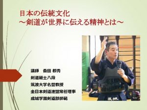 2024年、日本の伝統文化である剣道の魅力が、世界に向けて今まで以上に大きく花開こうとしています。対人競技である剣道は、コロナ禍によって、その競技の実践において多大な試練を迎えました。しかし、様々な感染対策による競技ルールなどの見直しは、剣道の魅力をさらに高めるきっかけともなり、世界から剣道の発展、文化貢献に大きな期待が寄せられることとなりました。お互いを尊重し、敬い、感謝の気持ちを忘れない剣道精神。その為の稽古、試合、交流。剣道競技、剣道交流のあり方は、揺るぎない世界平和への羅針盤と言えるでしょう。37年の長きにわたり、日本学生剣道界の雄、筑波大学にて剣道指導にあたられた香田郡秀範士八段が、これまでの教育剣道実践の経験を踏まえ、今後、世界に向けた剣道文化の意義を語ります。