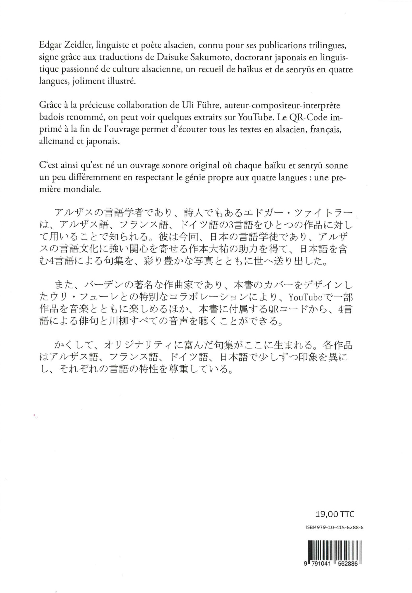 ハンノキの葉のうえでー俳句と川柳/作本大祐(65文F) ツイート ハンノキの葉のうえでー俳句と川柳 2025年 Edgar Zeidler, Daisuke Sakumoto(作本大祐 65文F) Oliver Klencklen(印刷) 定価:19€ ISBN:979-10-415-6288-6 アルザスの言語学者と日本の言語学徒がおくる、アルザス語、フランス語、ドイツ語、 日本語の4言語による句集。付属のQRコードからすべての句の音声を聴くことができる。 (※大祐の祐は示に右) 2025年5月29日 カテゴリー:同窓会会員の著書等/タグ: 作本大祐