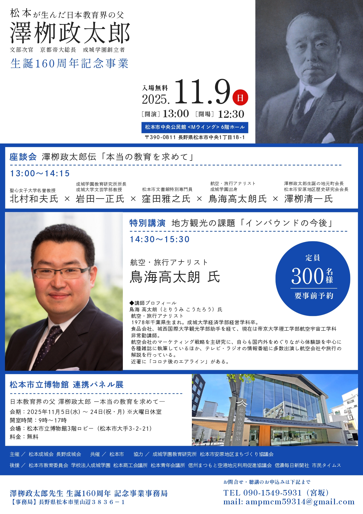 澤柳政太郎先生生誕150周年記念事業は松本市、学校法人成城学園の共同開催により、