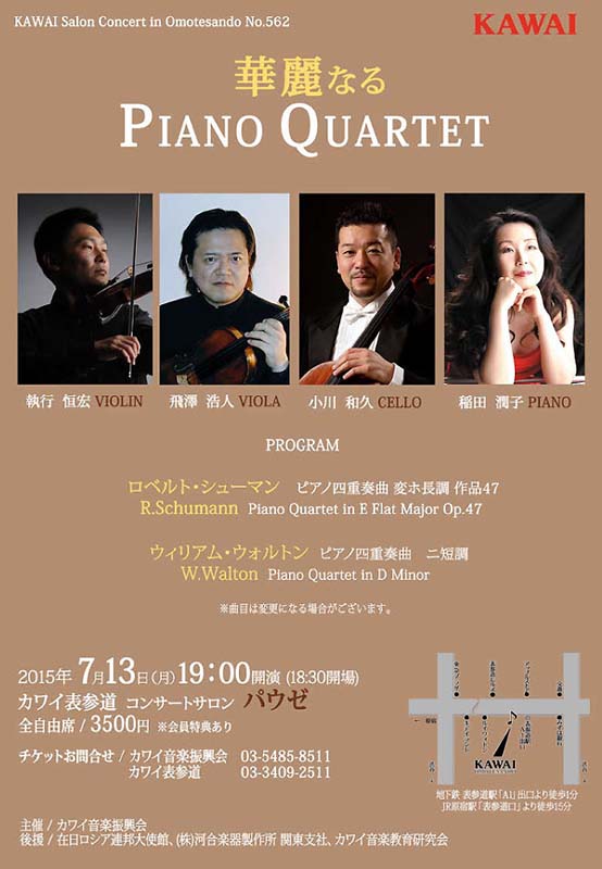華麗なる PIANO QUARTET/稲田潤子(中学欅) ツイート 5月5日の澤柳記念講堂のこけらおとしにて素晴らしい演奏を 聴かせてくれた稲田潤子さん(中学欅)がコンサートを開きます 2015年7月13日(月)18:30開場 19:00開演 入場料:3,500円(全席自由) 会場:カワイ表参道 コンサートサロンパウゼ お問い合わせ:カワイ音楽振興会 03-5485-8511 カワイ表参道 03-3409-2511 2015年6月30日 カテゴリー:同窓会会員のイベント等/タグ: 稲田潤子