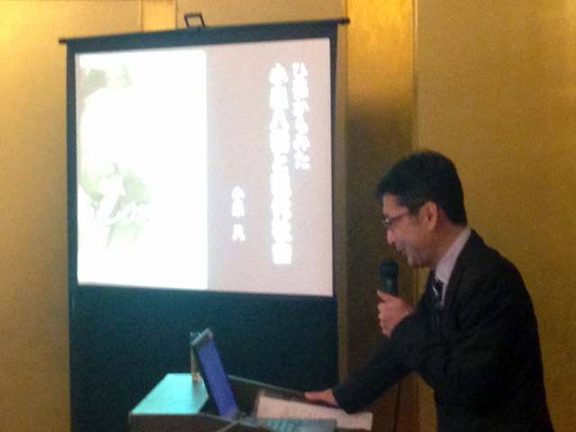 会計報告等の後、小泉凡さん(27文芸A)による「ひ孫からみた小泉八雲と現代社会」と題した講話は、