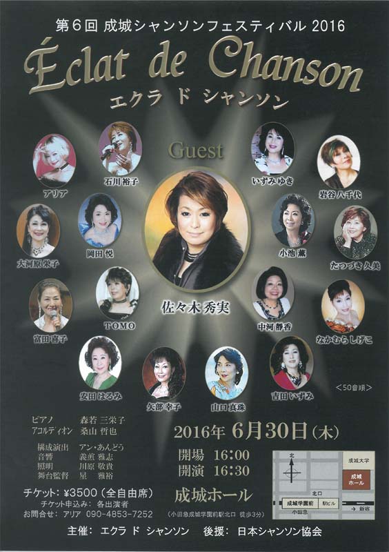 Éclat de Chanson/吉田いずみ(16文E・岩崎) ツイート 第6回成城シャンソンフェスティバル2016 エクラ ド シャンソン 2016年6月30日(木) 開場 16:00 開演16:30 成城ホール 成城学園前駅北口徒歩3分 3500円(全自由席) 主催:エクラ ド シャンソン 後援:日本シャンソン協会 2016年6月27日 カテゴリー:同窓会会員のイベント等/タグ: 吉田いずみ