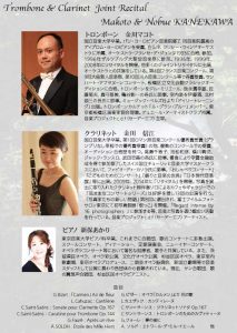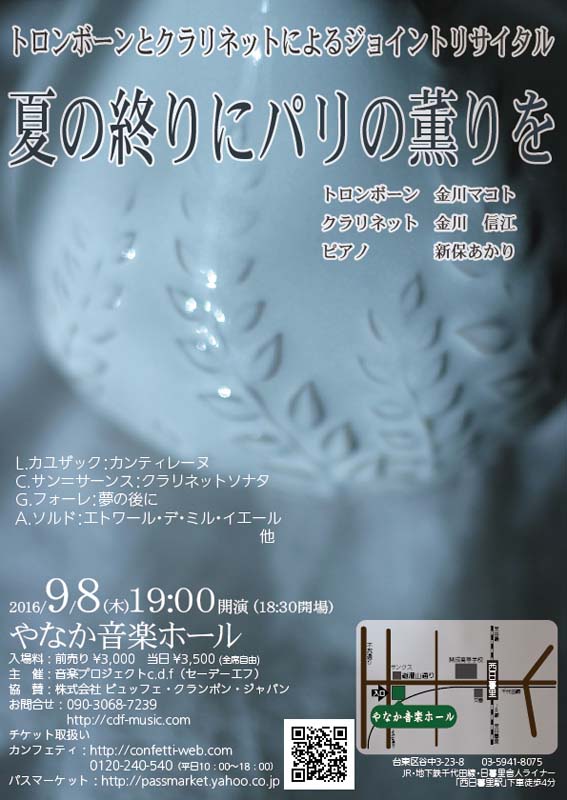 夏の名残と秋の気配を感じる9月の晩、パリの薫り漂うフランス作曲家の作品を、トロンボーン、クラリネット、ピアノの音色でお楽しみ頂きます。コレペティでもあるピアニストを迎え、管楽器で奏でるオペラの名曲も一興です。