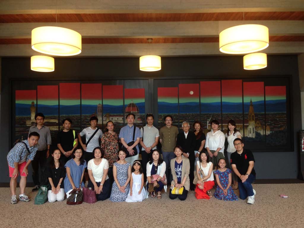 今回の目的は、記念講堂の入口正面に飾られた柳沢正人先生の絵画作品「神の棲む街 フィレンツェ」を囲み、柳沢先生から直々にお話を伺う、というものでした。