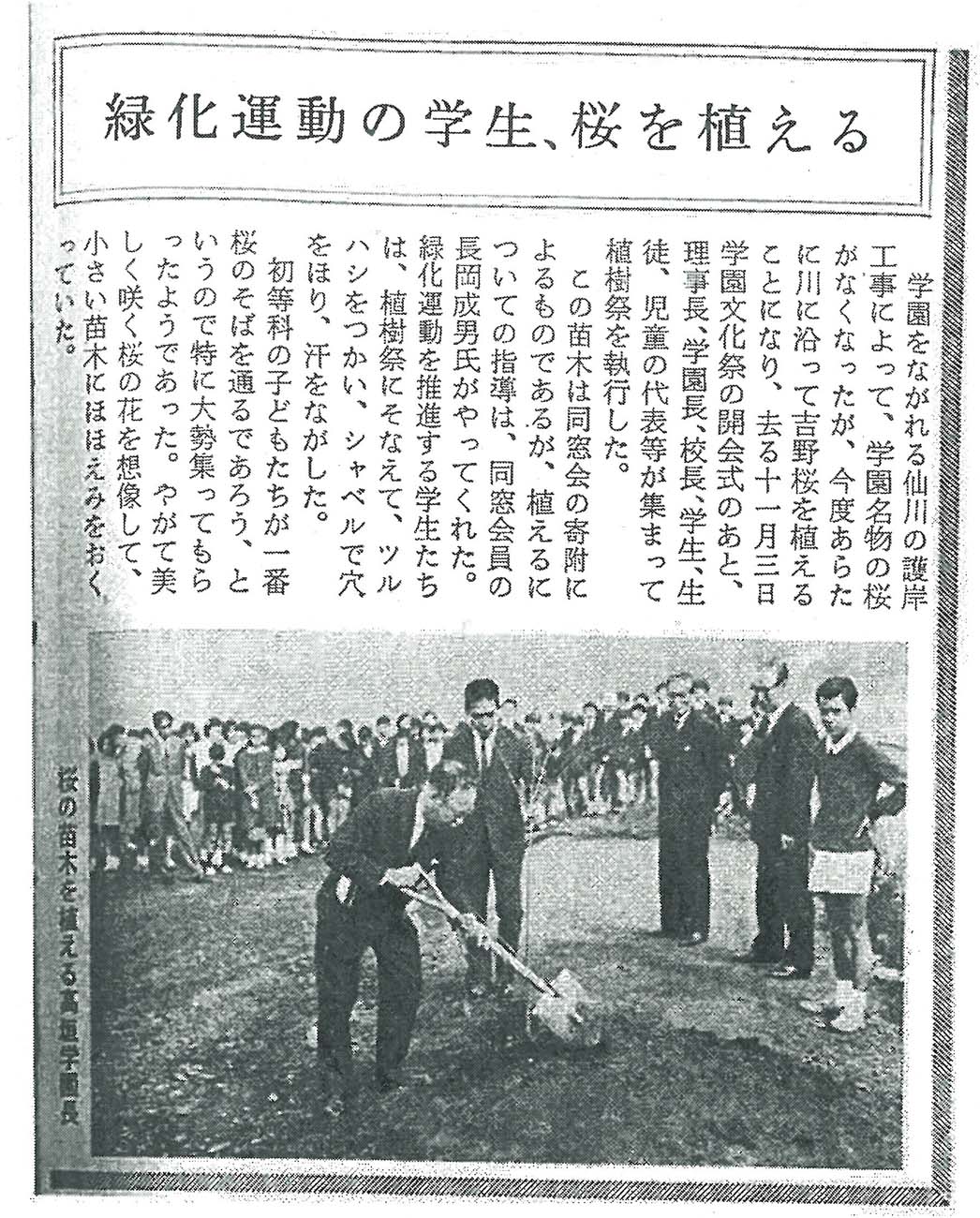 この並木は仙川の護岸工事によって失われた初代桜並木の復元を目指し、当時の高校生たちが1966年に始めた古新聞集めがきっかけとなり足掛け2年の全学園的な運動に広がり1967年秋に植樹が実現したものです。