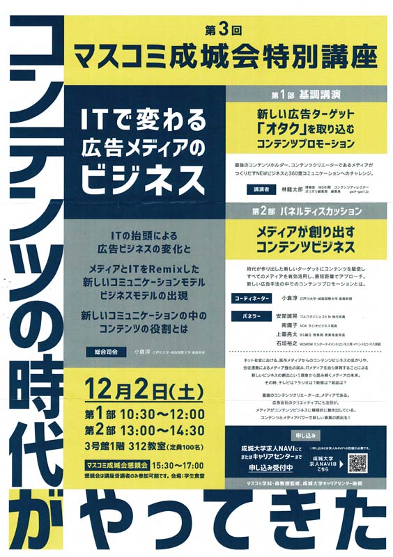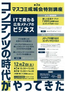 マスコミ成城会 総会・特別講座 ツイート 2017年12月2日(土) 総 会 15:00~15:30 法人事務棟3階 懇親会 15:30~17:00 学生食堂 同日開催 マスコミ成城会特別講座「コンテンツの時代がやってきた」 10:30~14:30 大学3号館312教室 2017年10月3日 カテゴリー:支部会情報/タグ: マスコミ成城会