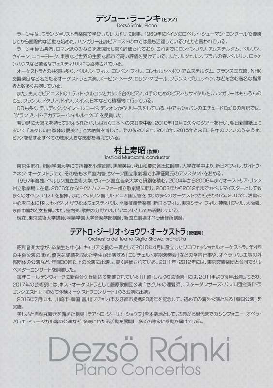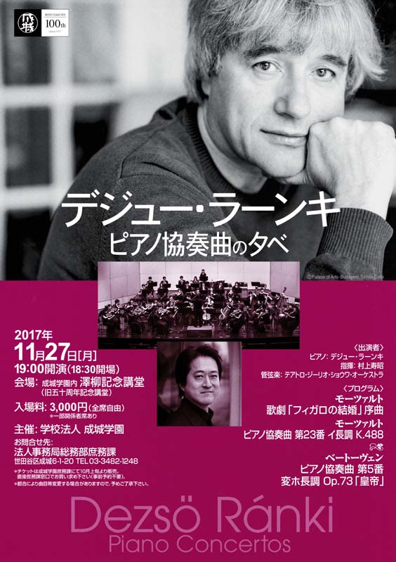 【成城学園主催】デジュー・ラーンキ ピアノ協奏曲の夕べ ツイート 日時:2017年11月27日(月) 18:30開場 19:00開演 会場:成城学園内 澤柳記念講堂 入場料:3,000円(全席自由) <出演者> ピアノ:デジュー・ラーンキ 指揮:村上寿昭 管弦楽:テアトロ・ジーリオ・ショウワ・オーケストラ <プログラム> モーツァルト 歌劇「フィガロの結婚」序曲 モーツァルト ピアノ協奏曲第23番イ長調K.488 ベートーヴェン ピアノ協奏曲第5番 変ホ長調Op.73「皇帝」 2017年10月7日 カテゴリー:お知らせ/タグ: 成城学園